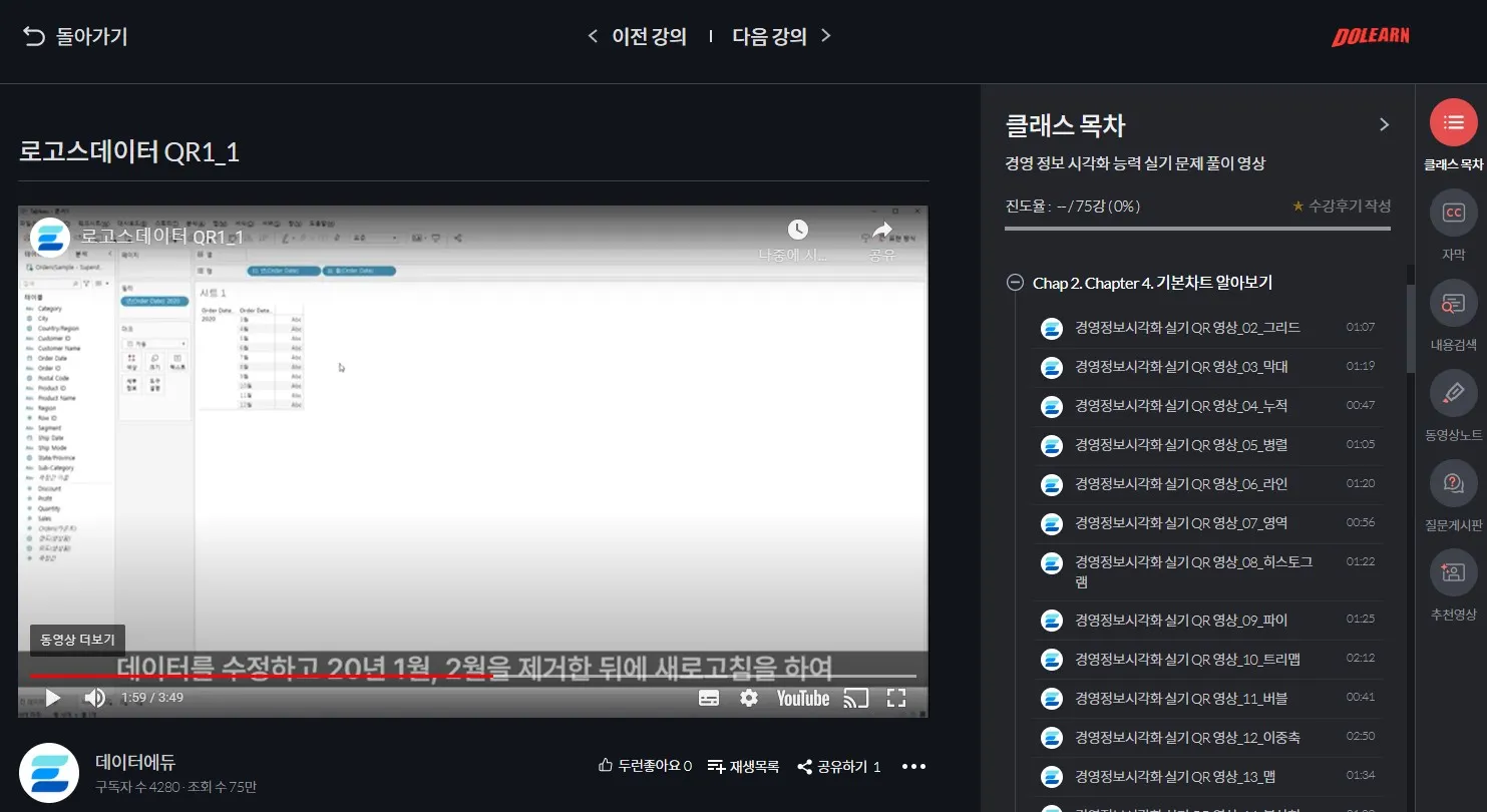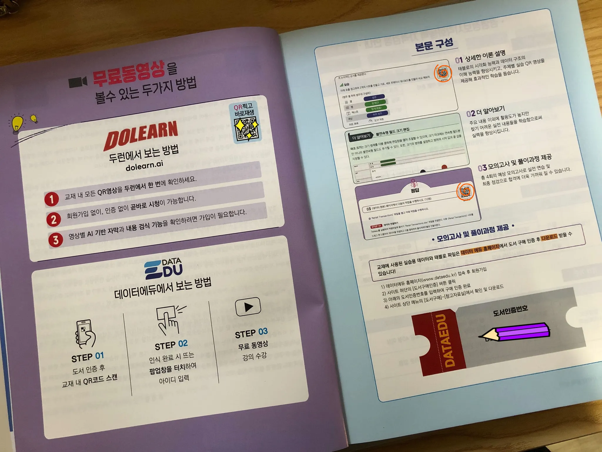 저는 실습 데이터 다운로드 경로를 찾기 위해 안내 페이지를 펼쳤는데 그보다 더 먼저 눈에 들어온 것은 좌측 상단의 ‘DOLEARN’(이하 ‘두런’)이라는 로고였습니다. 매번 QR 코드를 인식하는 것은 조금 귀찮다는 생각이 들던 참에 모든 ‘무료 동영상’을 한번의 QR 코드 인식으로 시청할 수 있다는 점이 흥미로워서 바로 QR 코드를 인식하고 접속했습니다.