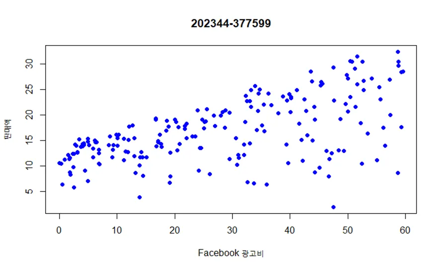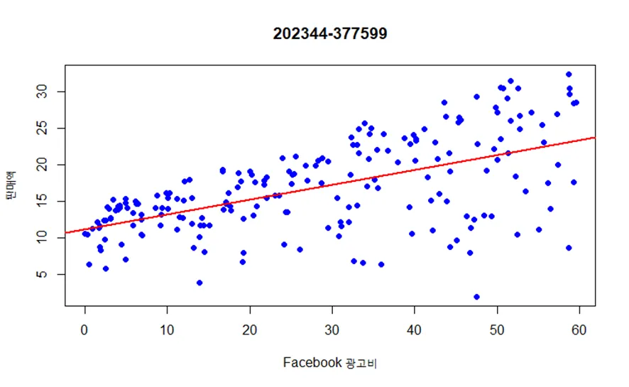 (2) facebook을 독립변수(설명변수)로, sales를 종속변수(반응변수, 결과변수)로 하는 회귀직선을 산점도 위에 그리시오. 산점도의 제목으로 본인의 학번을 출력하시오.