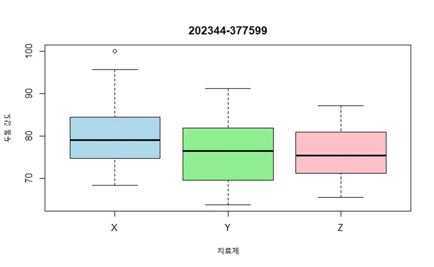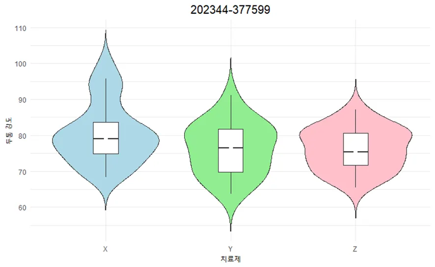 Q4. R의 datarium 패키지에 내장된 headache 데이터셋은 두통 치료제에 대한 임상시험에 참가한 두통 환자 72명의 데이터이다. 변수 treatment는 세가지 치료제 X, Y, Z 중 어느 치료제를 받았는지 나타내며, 변수 pain_score는 치료제를 투약한 후 두통의 강도를 점수로 나타낸 것이다. 이 데이터에서 치료제에 따라 두통의 강도의 분포가 어떻게 다른지 드러내는 데이터 시각화를 수행하시오. 그래프의 제목으로 본인의 학번을 출력하시오.