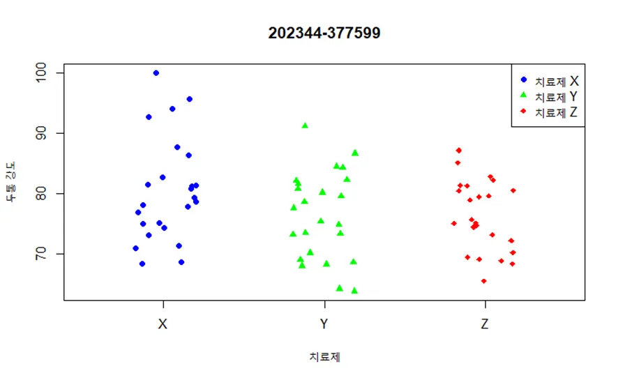 legend("topright", legend = c("치료제 X", "치료제 Y", "치료제 Z"),