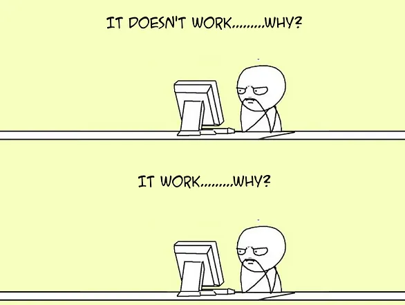 개인적인 이야기를 나누자면, 저 또한 데이터 분석을 처음 공부하던 시기에는 ‘Computer Science’에 대한 어려움을 겪었습니다. 프로그래밍이 처음이 아니었음에도(초등학생 시절에 Basic과 C를 독학한 적이 있습니다.), 파이썬 Python / 판다스 Pandas / 넘파이 Numpy 사이에 갇혀서 ‘이 코드가 왜 작동하지 않지?’라는 질문을 하루에도 열 번 넘게 했던 시기가 있었습니다. 프로그래밍을 하시는 분들은 다음의 ‘밈’이 익숙하실 것 같은데요, 데이터 분석 공부라고 예외는 아닙니다. (웃음)
