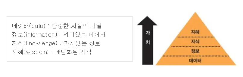 지혜 : ‘지식’을 일반적인 패턴으로 정리한 결과 (ex. 상당수의 직장인은 아침 출근길에 커피를 산다. → 해당 시간대에 가격 할인을 시행하면 매출이 증가할 수 있다.)
