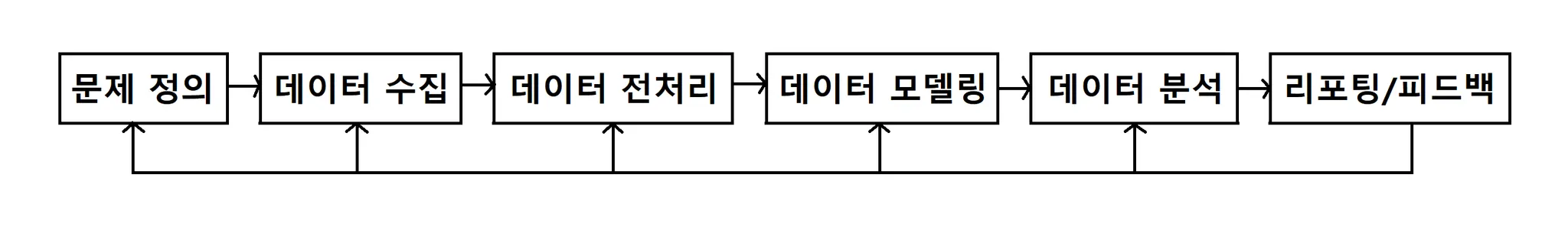 문제 해결 주체의 크기(개인/기업/정부 등), 문제 그 자체의 크기 등과 관계 없이 대부분의 데이터 분석은 다음과 같은 절차를 따릅니다.